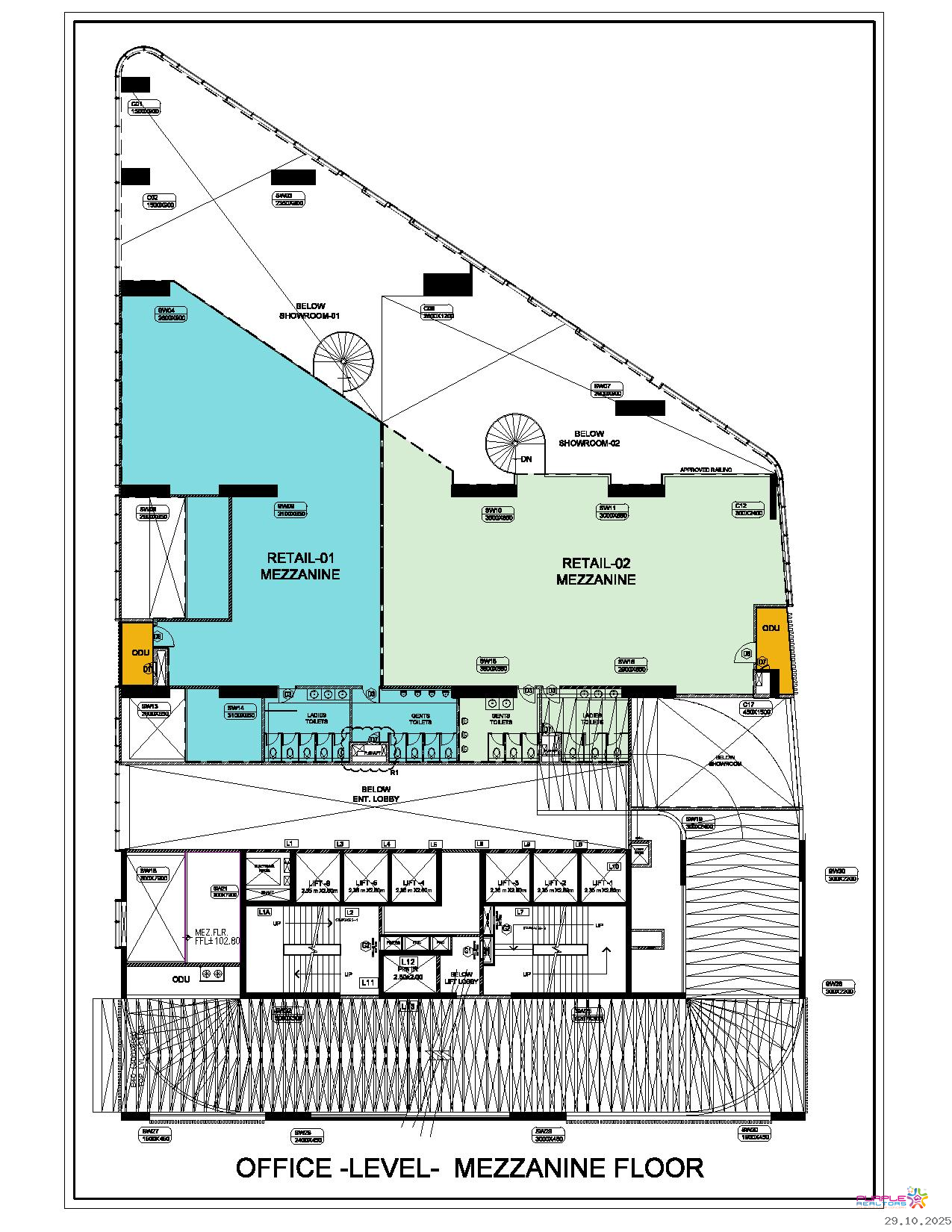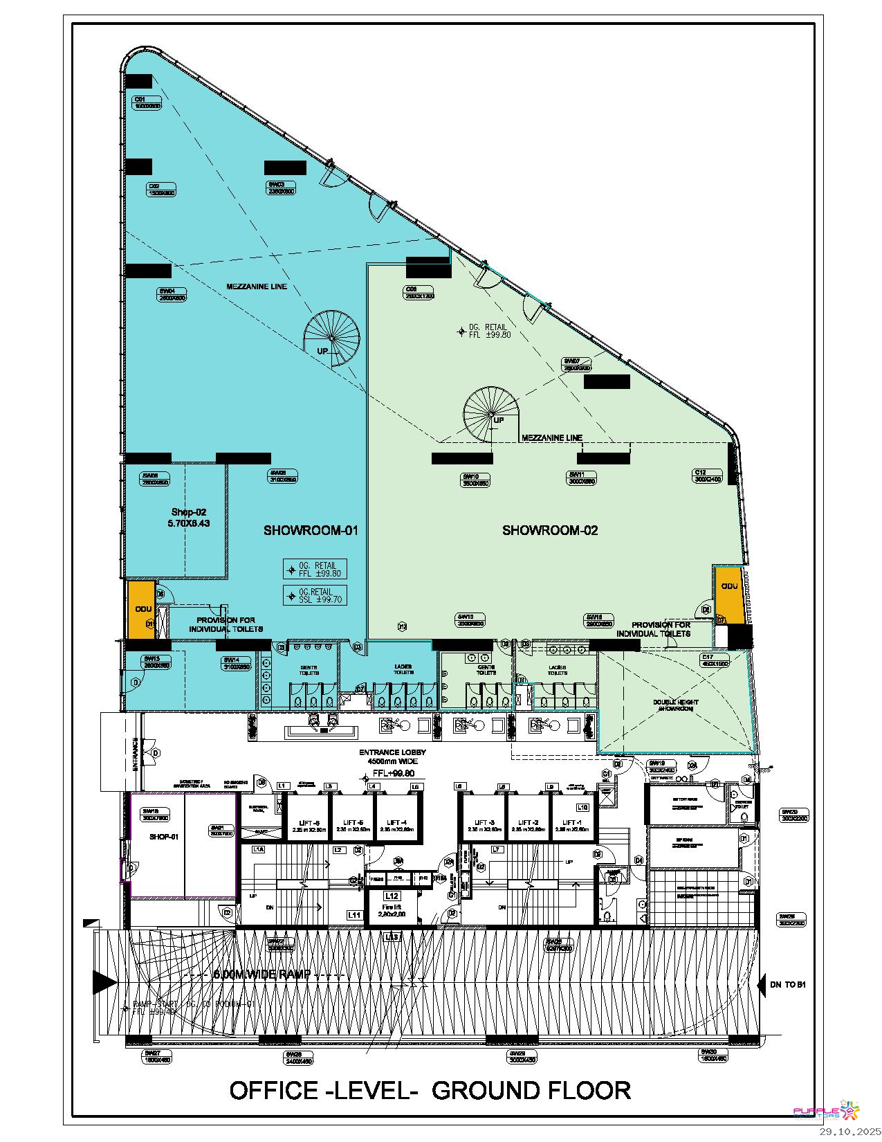This design features a glass-enclosed building with curvilinear petal shapes, offering a modern urban presence. It includes 2 basements, 5 podium levels for parking, and retail space on the ground floor, with office floors above and a terrace restaurant. Sustainability is a key focus, with IGBC Platinum Pre-certification for New Buildings and Health & Well-Being. The building incorporates high-performance glass for heat reduction, low-VOC finishes for healthier interiors, natural ventilation, and water-saving low-flow fixtures. This project sets a new standard for sustainable, modern office and retail environments.