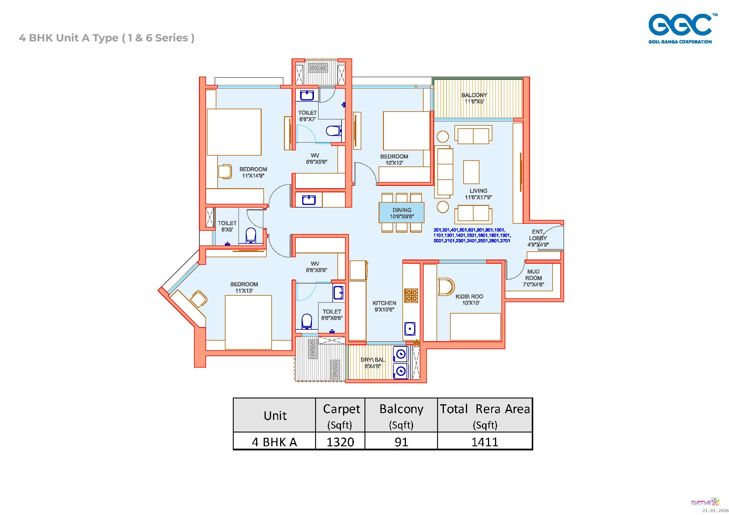 4 BHK – Carpet 1411 sq. ft. - 1.97 Cr Onwards
