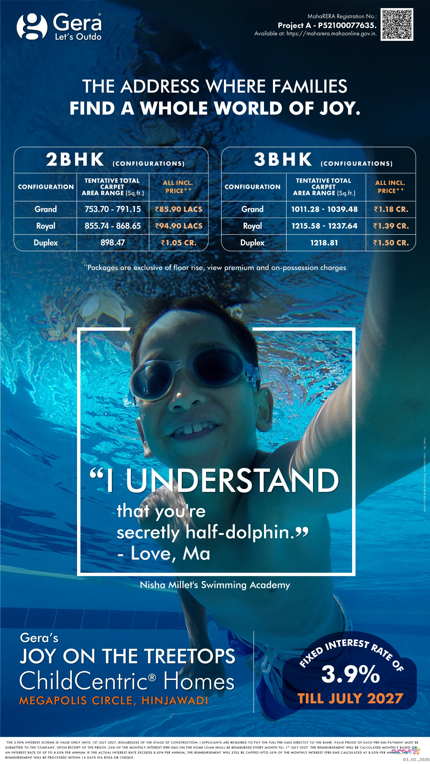 Introducing Gera’s Upcoming ChildCentric Homes at Hinjawadi Highlands, Hinjawadi's first-ever ChildCentric® Homes (CCH), where family living meets unparalleled luxury. This exquisite project spans 10.7 acres and features a remarkable 35,000+ sq. ft. clubhouse alongside 150,000+ sq. ft. of open-to-sky amenity spaces. With over 30 thoughtfully curated amenities, including an exclusive electric Go-Kart racing track, a half Olympic-sized temperature-controlled swimming pool, and bowling alleys, Joy on the Treetops redefines the concept of modern living.