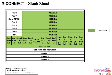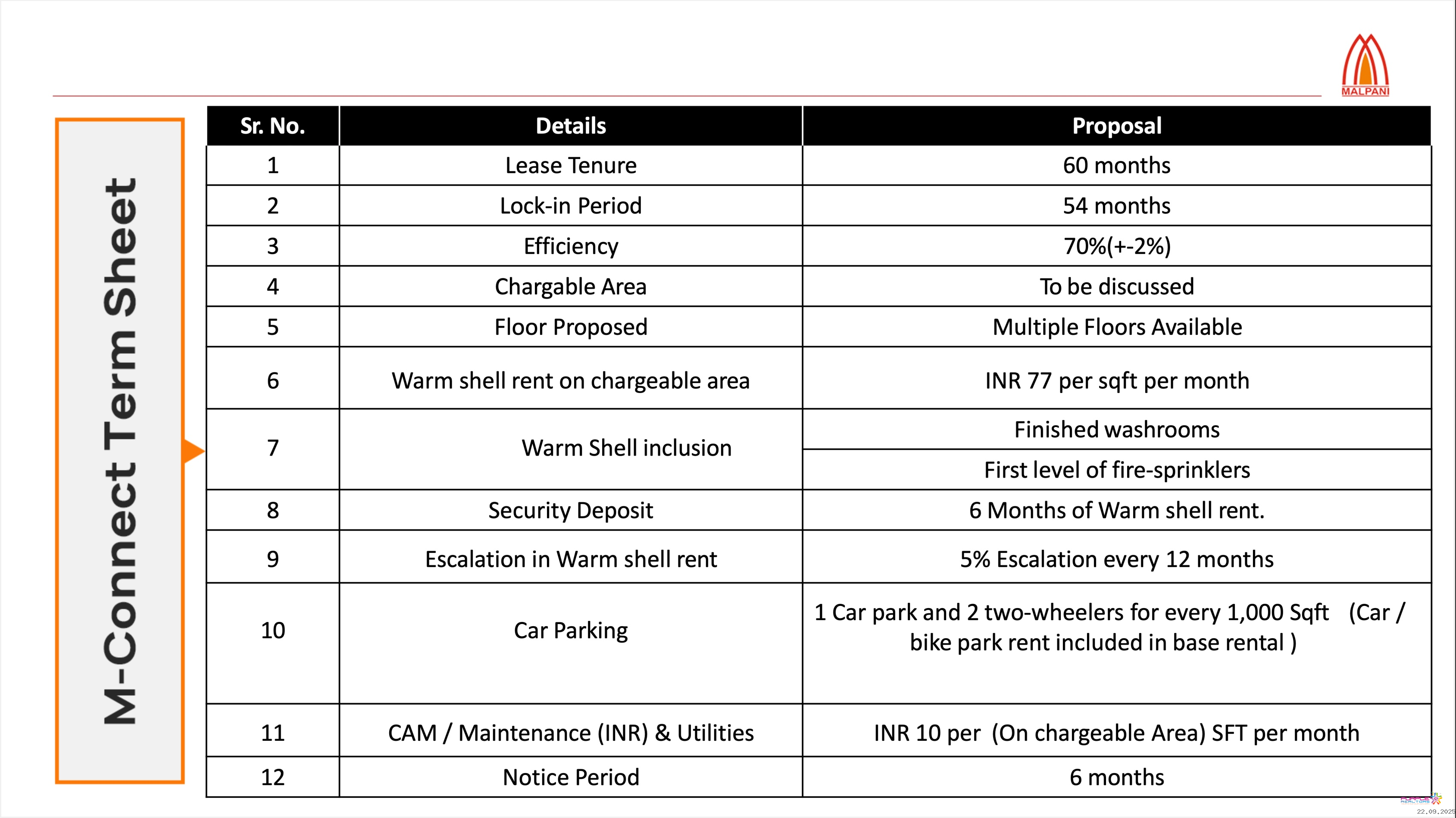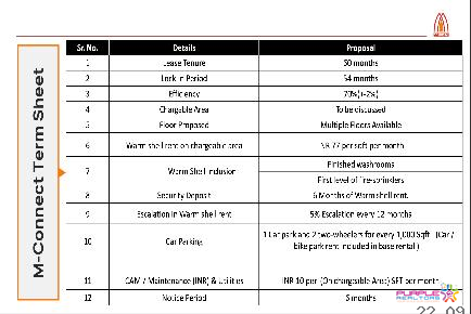 Base Rent (INR /sq.ft./month) - Office Space INR.77 /sq.ft. & for retail INR.110/sq.ft. Bare shell (finished toilet Blocks , property taxes, finished lift lobbies & common areas. (Not inclusive of Air-con )