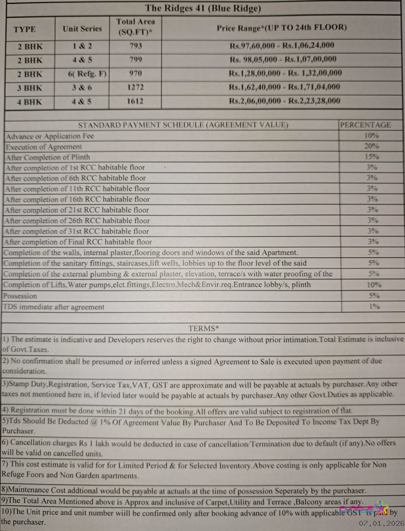 Possession:AS PER RERA ( THE RIDGES 41 - 20/12/2029 & THE ALTIUS - 31/01/2030 )