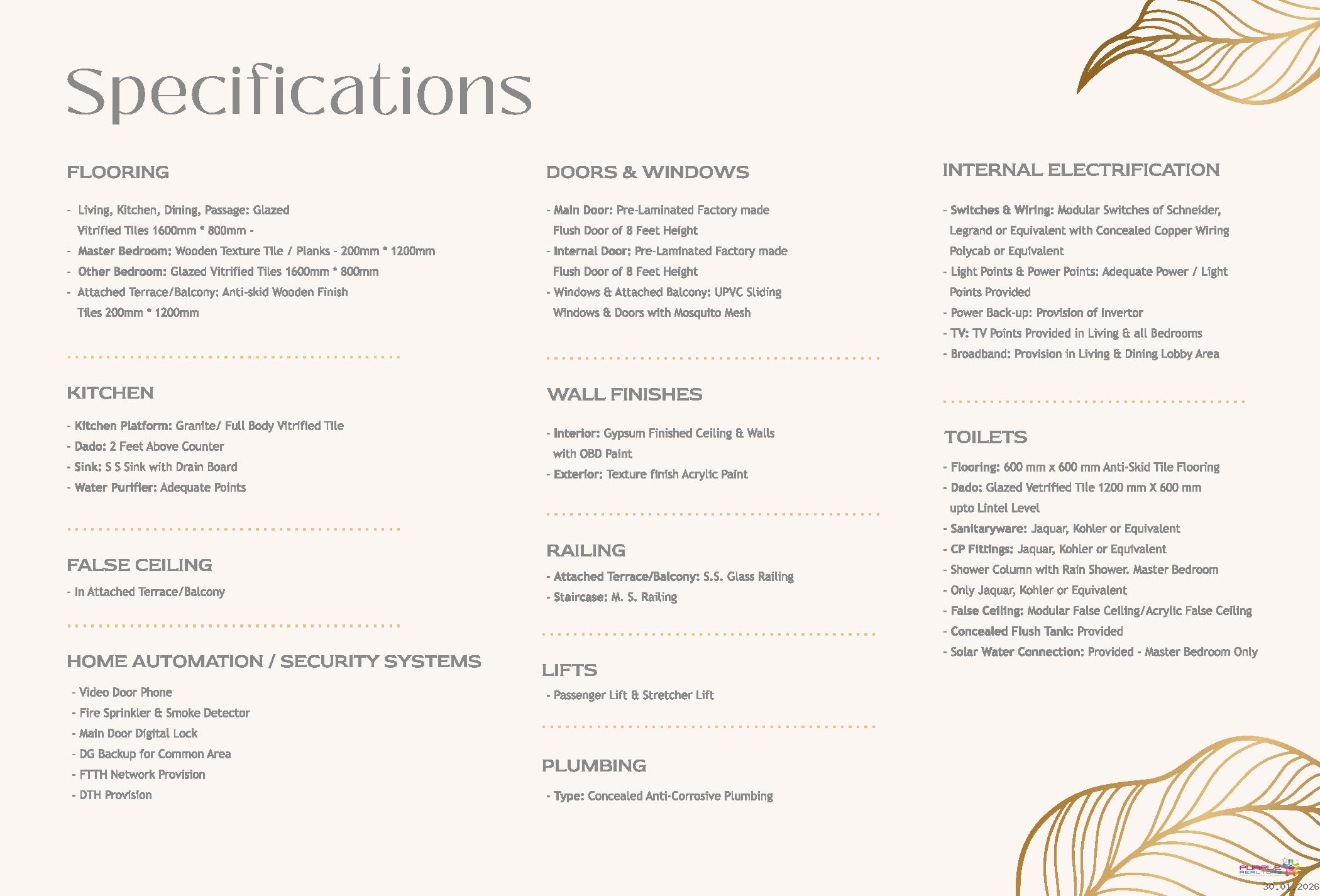 - Sanitaryware: Jaquar, Kohler or Equivalent