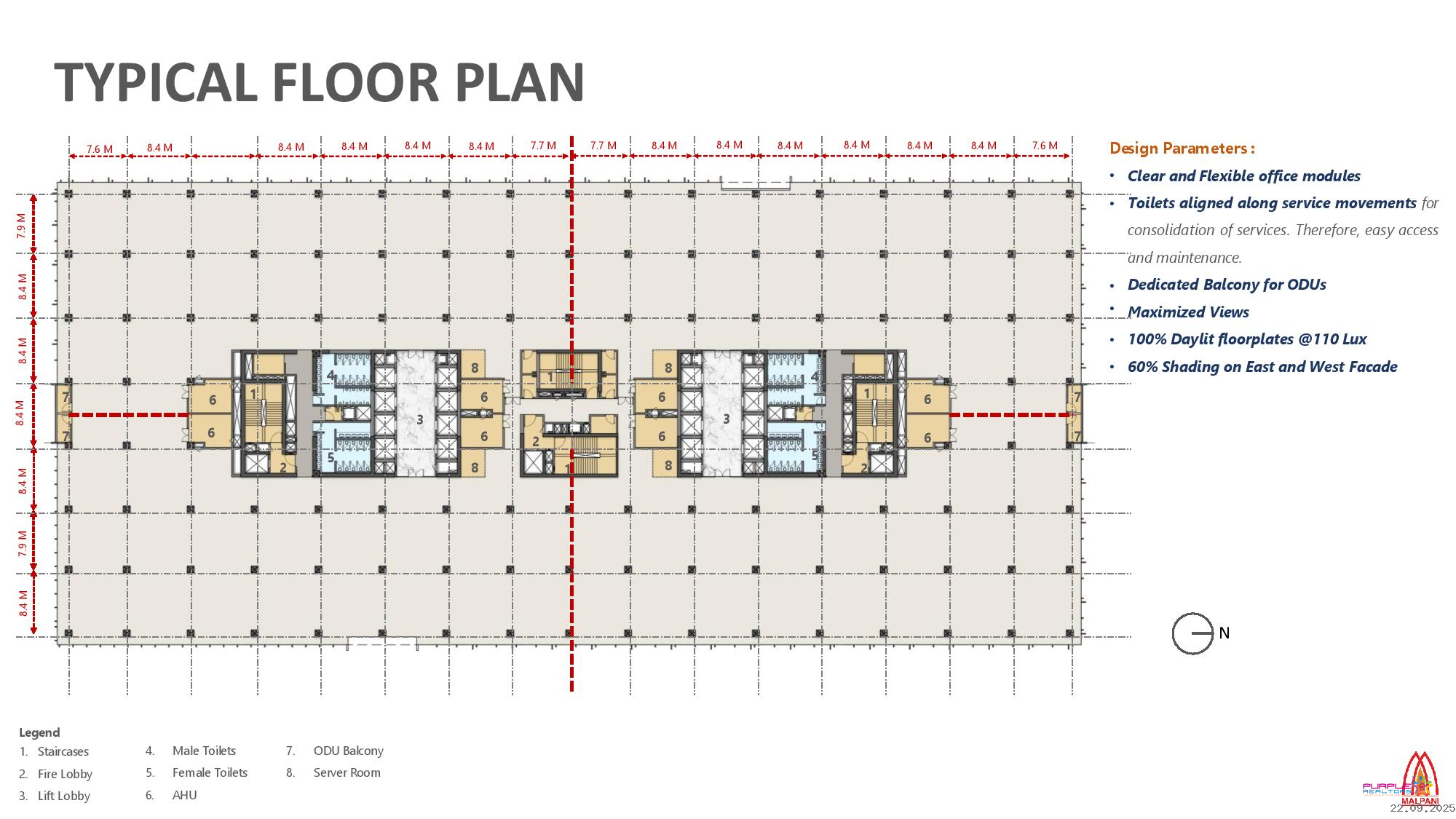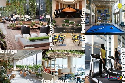 This office building features a central core design with glazing on all four sides to maximize daylight and views. It includes a basement and six podiums for parking, with seamless connectivity for vehicles and pedestrians. The ground floor offers a green plaza, retail space, and a covered drop-off area. The amenity level has a food court, meeting rooms, auditorium, e-gaming zone, and gym, while elevated office floors maximize space and provide clear views. The project is IGBC Platinum Pre-certified, with sustainable features like natural light on key facades and greenery on the podium