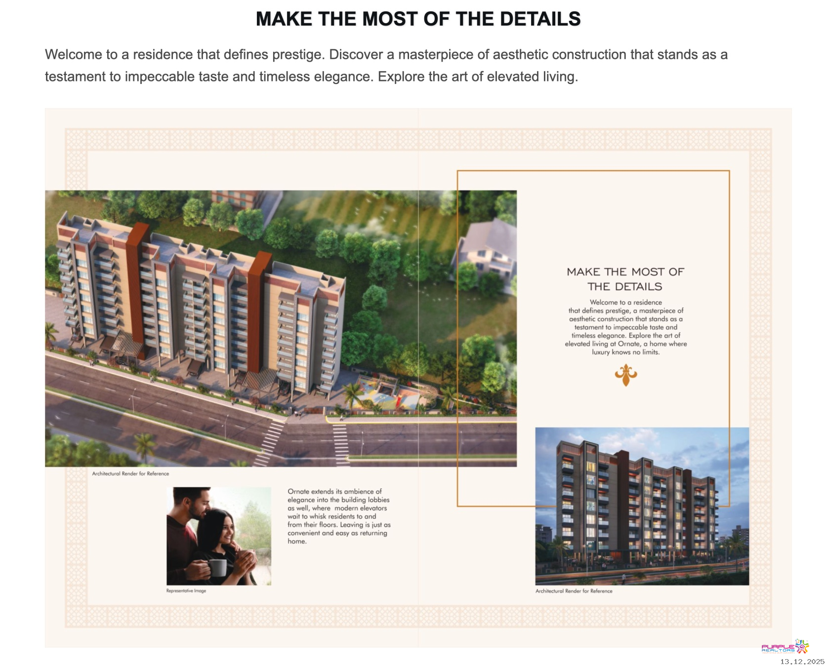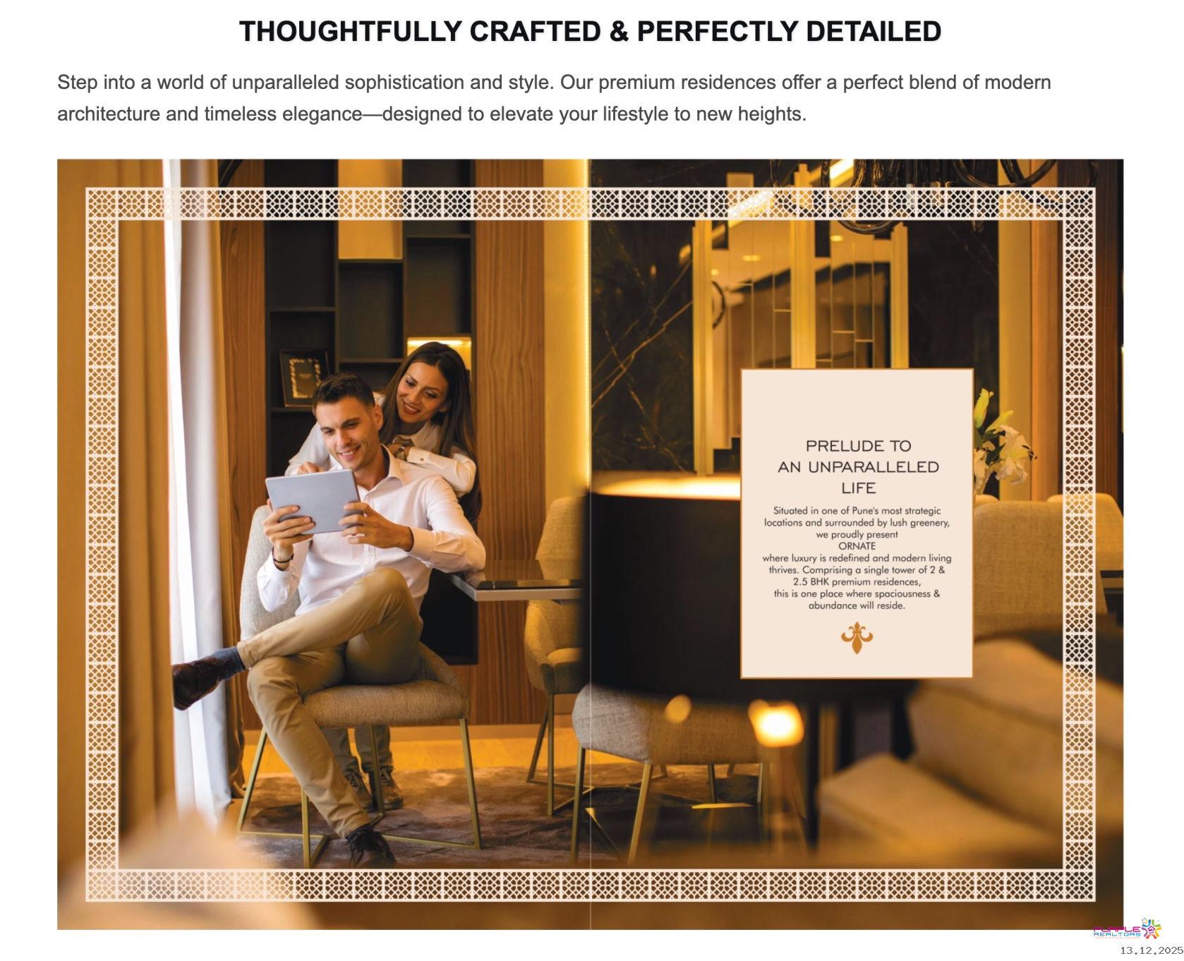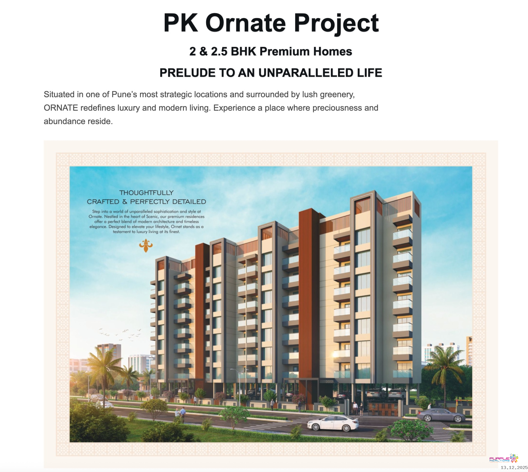 Nestled in one of Pune's most strategic locations and surrounded by lush greenery, Ornate redefines luxury and modern living. Comprising a single tower of 2 & 2.5 BHK premium residences, this is where preciousness and abundance reside. Ornate is thoughtfully crafted and perfectly detailed, offering a blend of modern architecture and timeless elegance.