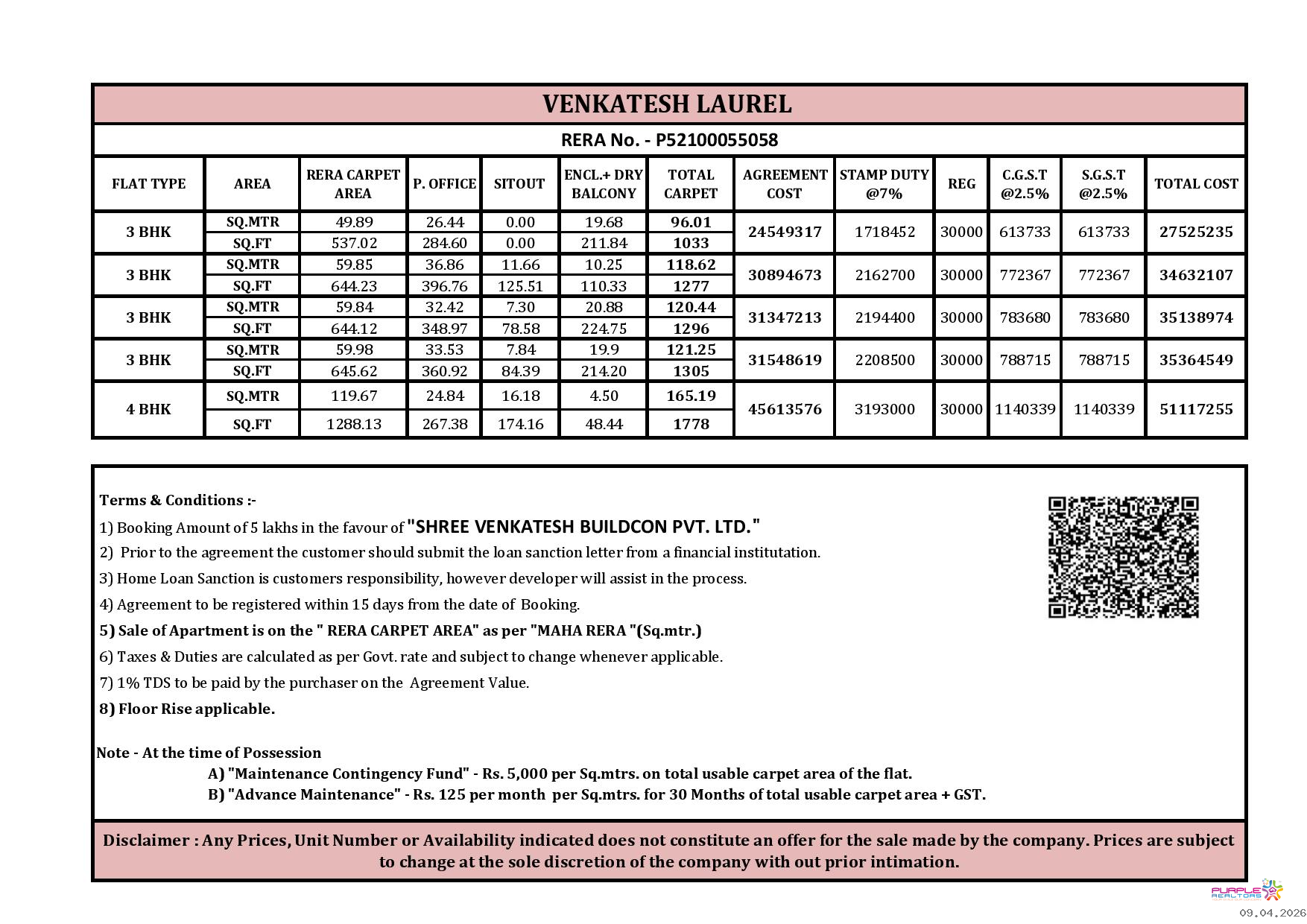 VENKATESH LAUREL BY SHREE VENKATESH BUILDCON PVT LTD (RERA NO P52100055058) SHIVAJI NAGAR PUNE 4 BHK 3 BHK